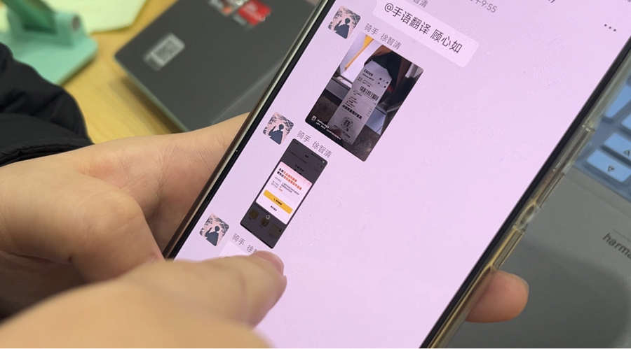 孙精精说,如果在以前,遇到这样的情况,就很着急,只能找路人或者邻居帮忙打电话,联系顾客出来。现在她可以第一时间发求助信息到群里,找手语翻译帮忙联系。